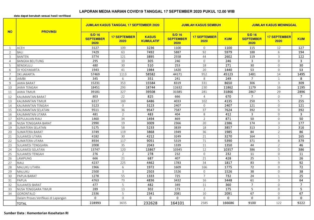PEKANBARU – Kasus positif virus Corona (Covid-19) di Indonesia hari ini, Kamis (17/9/2020), bertambah 3.635 orang. Dengan penambahan tersebut, total kasus positif virus Corona di Indonesia hari ini menjadi 232.628 orang.