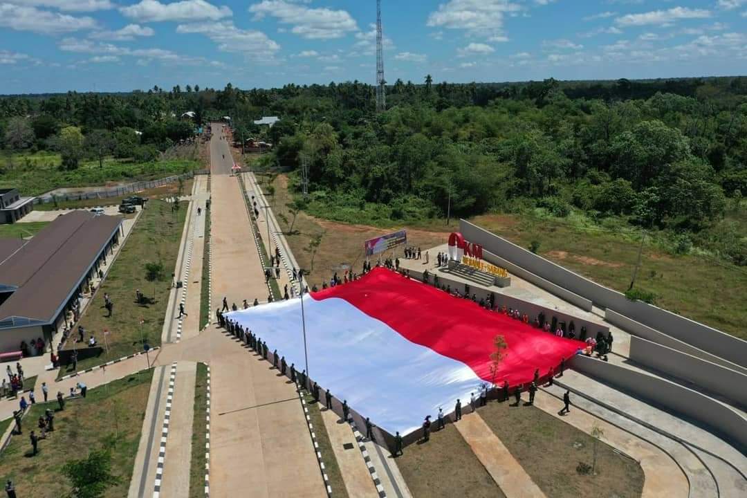 Pembentangan bendera Merah Putih Raksasa di Titik 0 Kilo Meter Pos Lintas Batas Negara (PLBN) RI-PNG Sota Merauke dilakukan oleh perwakilan seluruh komponen masyarakat dengan tetap berpedoman dengan protokol kesehatan Covid-19.