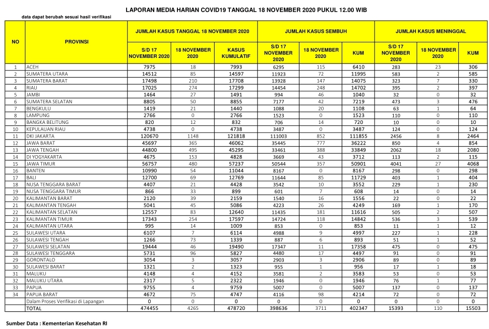 Berikut sebaran 4.265 kasus baru Corona di Indonesia, Rabu (18/11/2020):