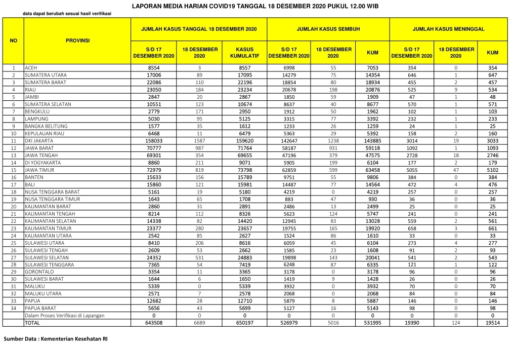 Berikut sebaran 6.689 kasus baru Corona di Indonesia, Jumat  (18/12/2020):