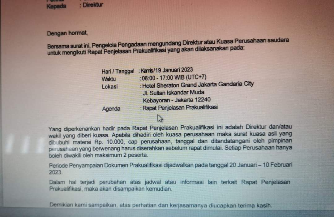 Dari undangan diperoleh riausatu.com dari sumber yang enggan namanya diposting, Direktur atau Kuasa rekanan diminta hadir mengikuti Rapat Penjelasan Prakualifikasi pada Kamis, 19 Januari 2023, pukul 08.00 s/d 17.00, Hotel Sheraton Grand Jakarta Gandaria City, Jalan Sultan Iskandar Muda Kebayoran, Jakarta-12240.