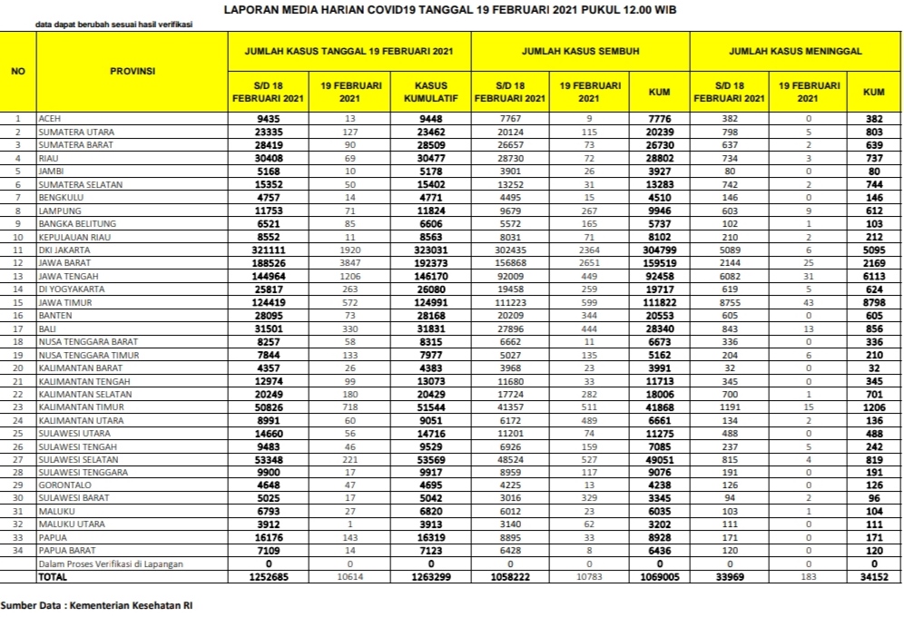 Berikut sebaran 10.614 kasus baru Corona di Indonesia, Jumat (19/2/2021):