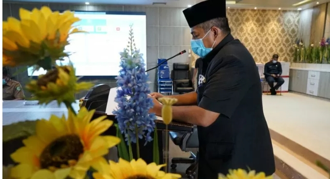 Siak – Bupati Siak Alfedri menyampaikan jawaban Pemerintah Daerah Kabupaten Siak terhadap Penyampaian Laporan Keterangan Pertanggungjawaban (LKPj) Kepala Daerah Tahun 2020 dan Pengumuman Pembentukan Pansus melakukan video  onference, Senin.