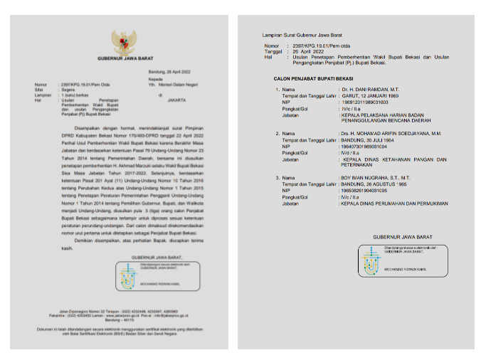 Mengutip Jabarprov.go.id pada 11 Mei 2022 (baca: https://jabarprov.go.id/index.php/news/46629/Gubernur_Ridwan_Kamil_Usulkan_Tiga_Nama_Penjabat_Kepala_Daerah_), Gubernur Jawa Barat Ridwan Kamil sudah mengusulkan tiga nama ASN (Aparatur Sipil Negara) ke Kementerian Dalam Negeri untuk menjadi Pj Bupati Bekasi selepas periode masa jabatan 2017-2022 berakhir.