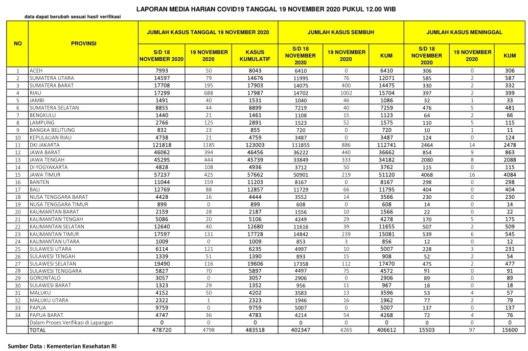 Berikut sebaran 4.798 kasus baru Corona di Indonesia, Kamis  (19/11/2020):