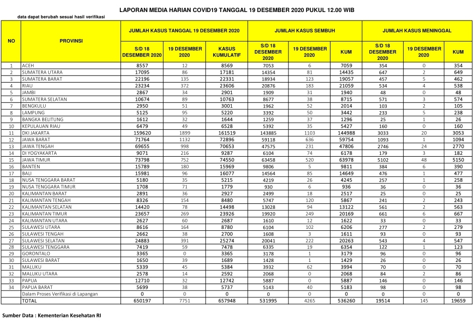 Berikut sebaran 7.751 kasus baru Corona di Indonesia, Sabtu (19/12/2020):