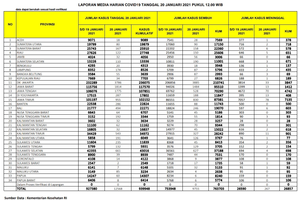Berikut sebaran 12.568 kasus baru Corona di Indonesia, Rabu (20/1/2021):