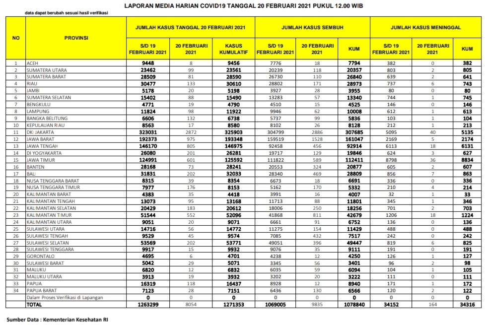 Berikut sebaran 8.054 kasus baru Corona di Indonesia, Sabtu (20/2/2021):