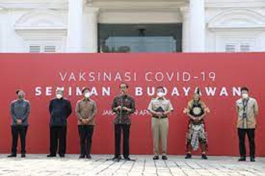 Jakarta – Tinjau secara langsung vaksinasi covid-19, Presiden Republik Indonesia, Joko Widodo, kepada 500 budayawan yang dilakukan di Galeri Nasional, pada Senin (19/04/2021).