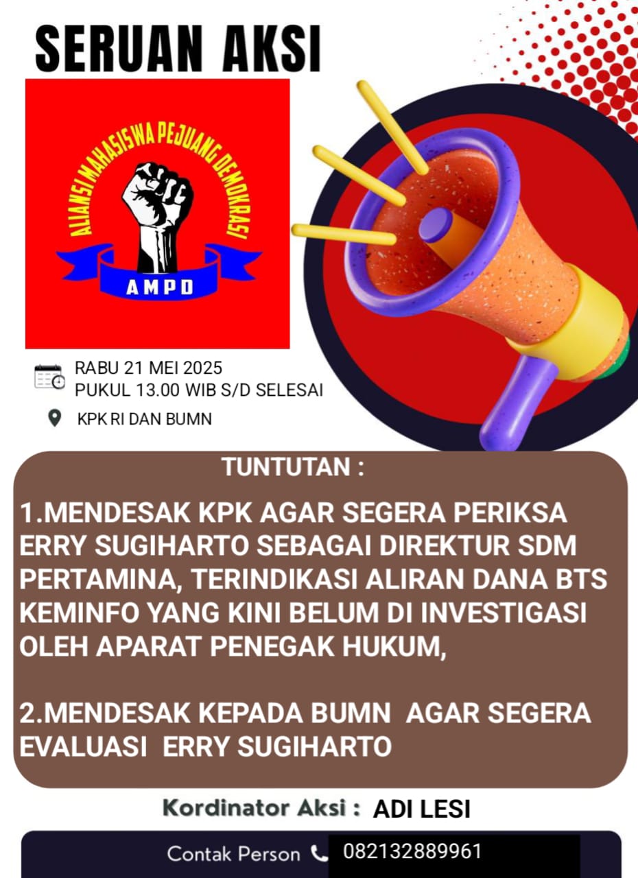 Aliansi Mahasiswa Pejuang Demokrasi (AMPD) dijadwalkan menggelar aksi unjuk rasa pada Rabu siang, 21 Mei 2025.
