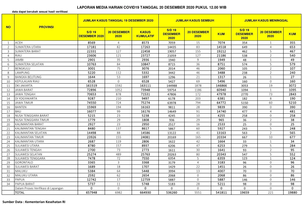 Berikut Sebaran 6.982 Kasus Baru Corona RI 20 Desember, Riau Tambah 121