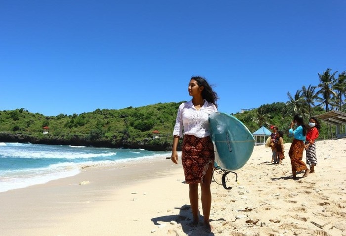 Salini Rengganis (23) merayakan Hari Kartini 2021 dengan berselancar di Pantai Srau. Setelan baju putih dipadu kain jarik bermotif lurik membuat sosoknya makin tampak eksotis. Pakaian itu sempat membuatnya kesulitan bergerak. Namun papan surfing akhirnya berhasil dia mainkan.