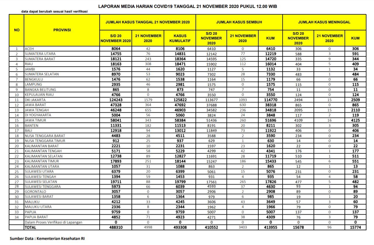 PEKANBARU – Kasus positif virus Corona (Covid-19) di Indonesia, Sabtu (21/11/2020), bertambah 4.998 orang. Dengan penambahan tersebut, total kasus positif virus Corona di Indonesia menjadi 493.308 orang.