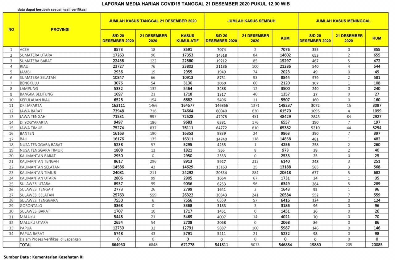 Berikut sebaran 6.848 kasus baru Corona di Indonesia, Senin (21/12/2020):
