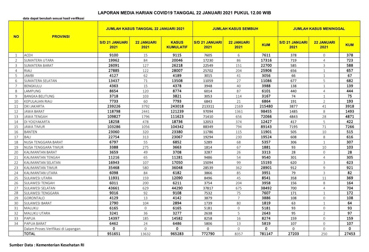 Berikut sebaran 13.632 kasus baru Corona di Indonesia, Jumat (22/1/2021):