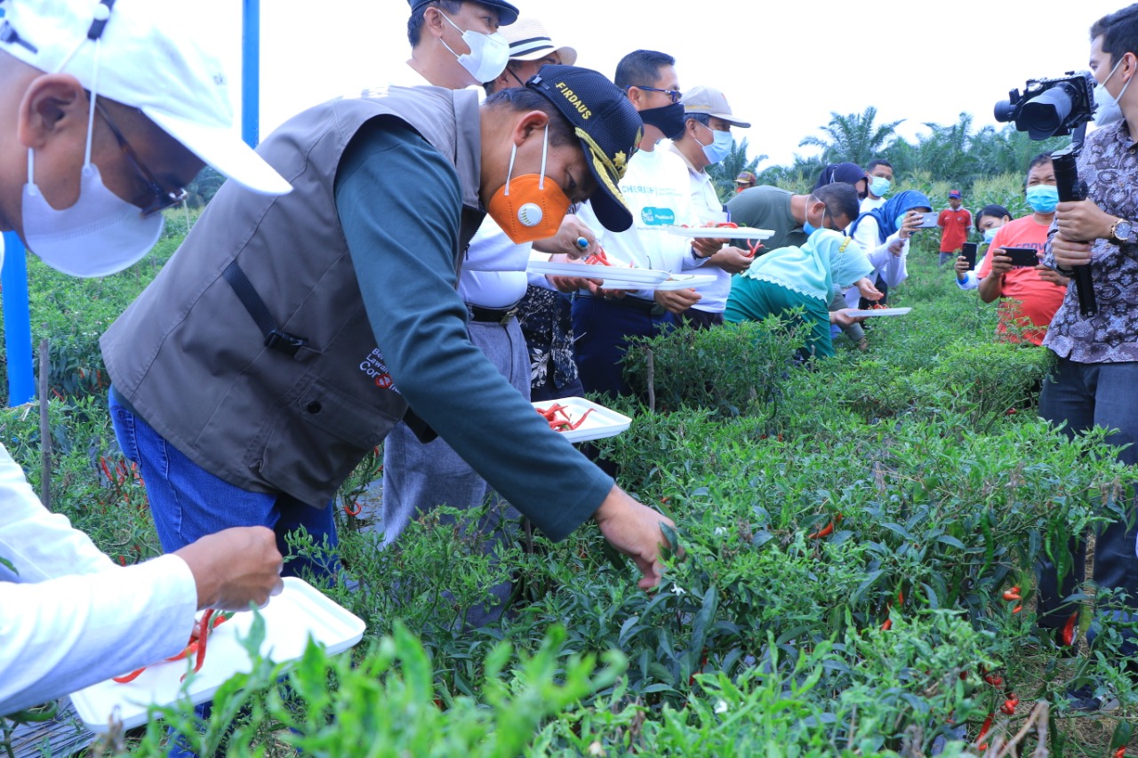 PEKANBARU – Walikota Pekanbaru memanen cabai di lahan Kelompok Tani Palas Mandiri, Jalan Sejahtera, Kelurahan Agrowisata, Kecamatan Rumbai Barat. Cabai yang dipanen merupakan jenis baru hasil budidaya beberapa generasi, Sabtu (20/2/2021).
