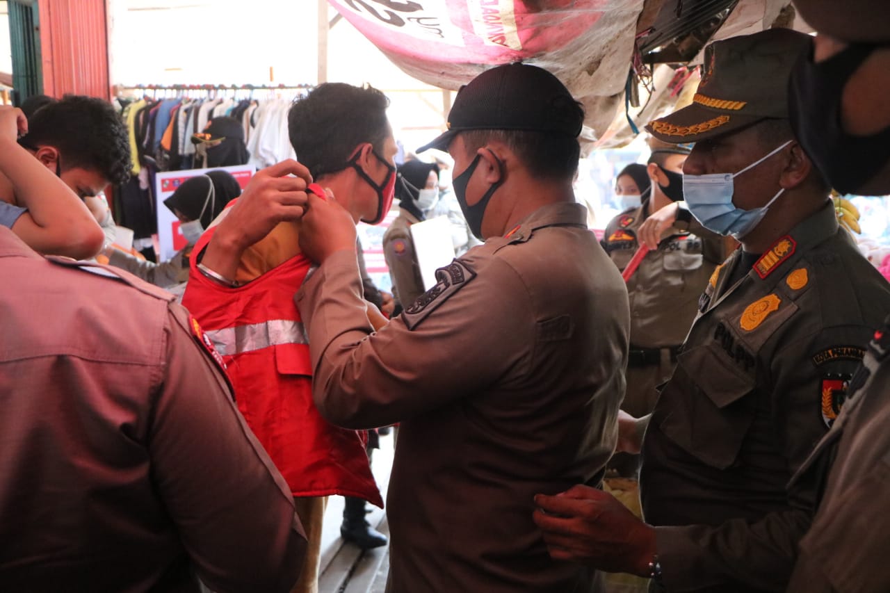 PEKANBARU – Tim gabungan terdiri dari Satpol PP Kota Pekanbaru, Badan Penanggulangan Bencana Daerah (BPBD) Pekanbaru, Dinas Perhubungan, Polisi dan TNI, sekitar pukul 09.00 WIB gelar razia protokol kesehatan (prokes) di Pasar Palapa, Jalan Durian, Senin (22/2/2021). Hasilnya, petugas gabungan jaring 54 orang pelanggar yang tidak menggunakan masker.