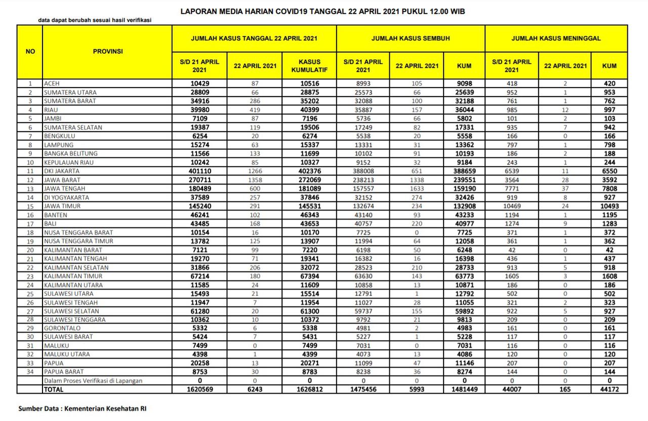 Berikut sebaran 6.243 kasus baru Corona di Indonesia, Kamis (22/4/2021):