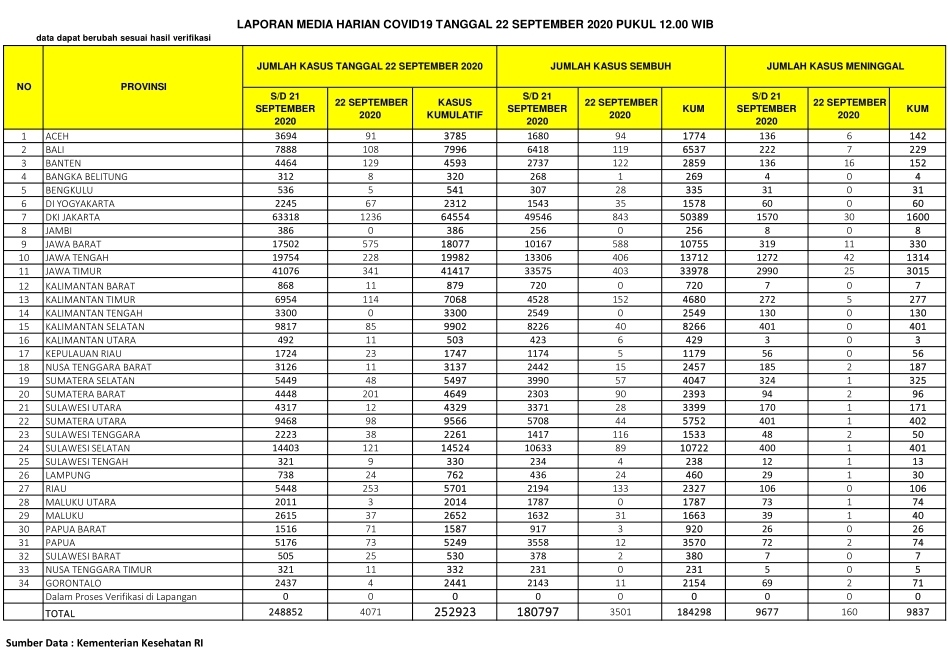 PEKANBARU – Kasus positif virus Corona (Covid-19) di Indonesia hari ini, Selasa (22/9/2020), bertambah 4.071 orang. Dengan penambahan tersebut, total kasus positif virus Corona di Indonesia hari ini menjadi 252.923 orang.