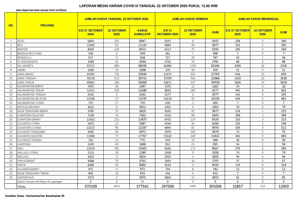 PEKANBARU – Kasus positif virus Corona (Covid-19) di Indonesia hari ini, Kamis  (22/10/2020), bertambah 4.432 orang. Dengan penambahan tersebut, total kasus positif virus Corona di Indonesia menjadi 377.541 orang.