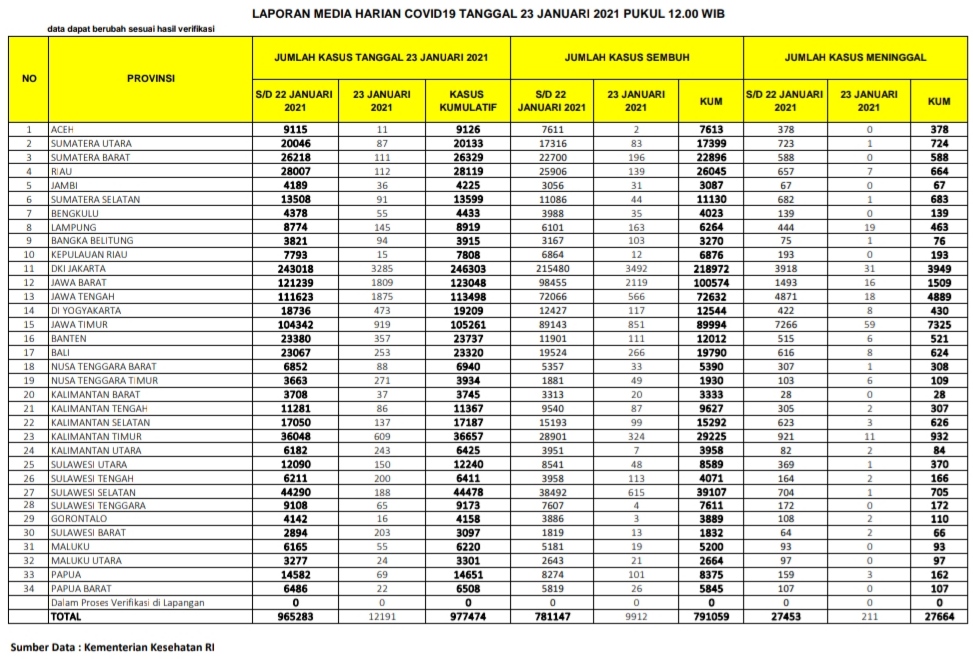 Berikut sebaran 12.191 kasus baru Corona di Indonesia, Sabtu (23/1/2021):