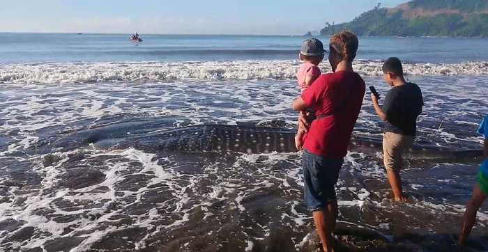 Saat ini bangkai hiu paus yang memiliki panjang lebih dari lima meter itu masih tergeletak di bibir pantai dan menjadi tontonan warga.