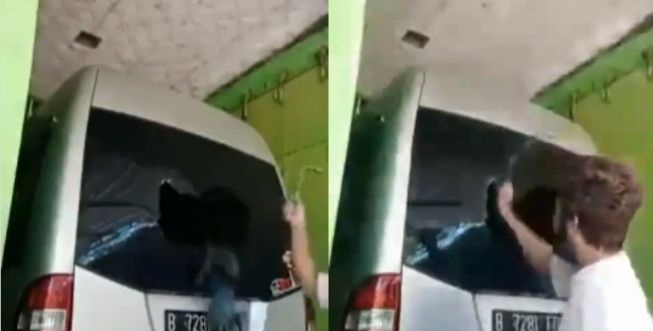 Lantas ia menggetokkan palu ke kaca belakang mobil di video tersebut sebanyak tiga kali.