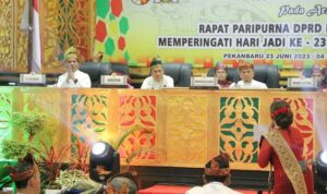 PEKANBARU (Siberindo.co) –  – DPRD Kota Pekanbaru, Jumat (23/6/2023), menggelar Rapat Paripurna dalam rangka memperingati HUT ke-239 Kota Pekanbaru. Paripurna dipimpin Ketua DPRD Pekanbaru Muhammad Sabarudi ST, didampingi Wakil Ketua Ginda Bernama ST MT, T Azwendi Fajri SE, dan Ir Nofrizal MM.