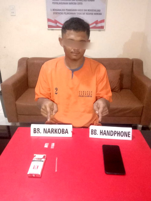 Dari hasil penggeledahan pelaku, sambungnya, kita temukan 1 paket sabu-sabu yang dibungkus dengan plastik bening dimasukkan kedalam kotak rokok Merk Sampoerna merah kecil.