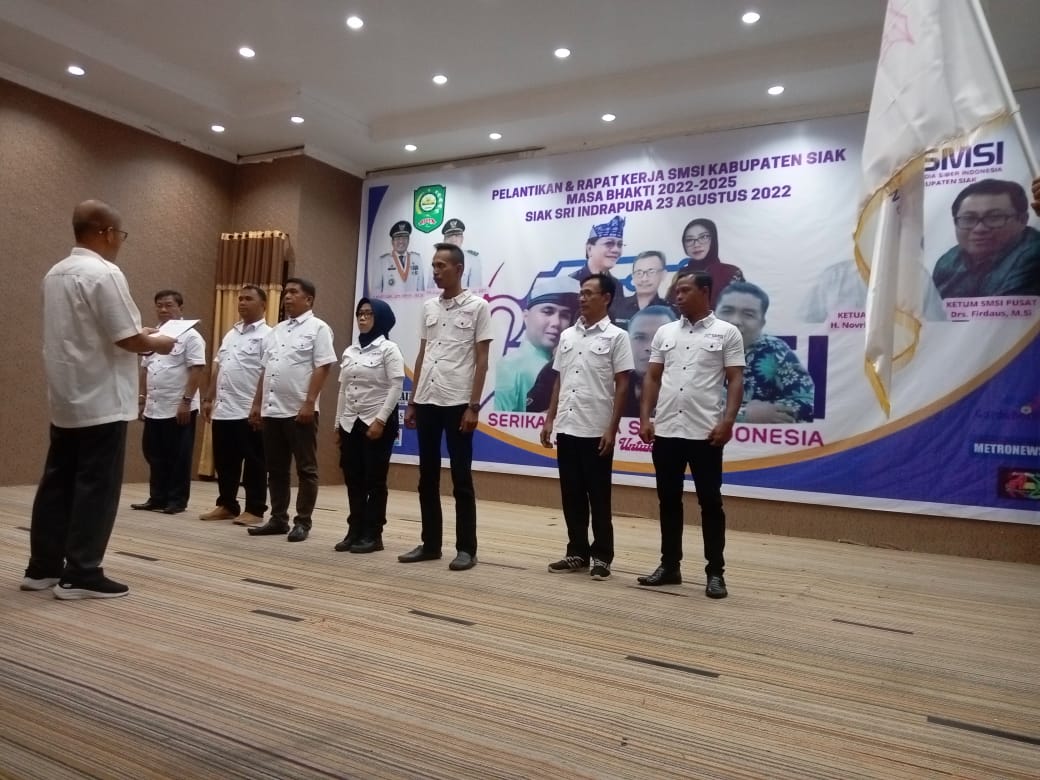 Pelantikan pengurus SMSI Siak oleh Ketua SMSI Provinsi Riau Novrizon Burman yang dipusatkan di Gedung Tengku Mahratu Siak, Selasa (23/8/2022) pagi itu, berjalan sukses dan lancar.