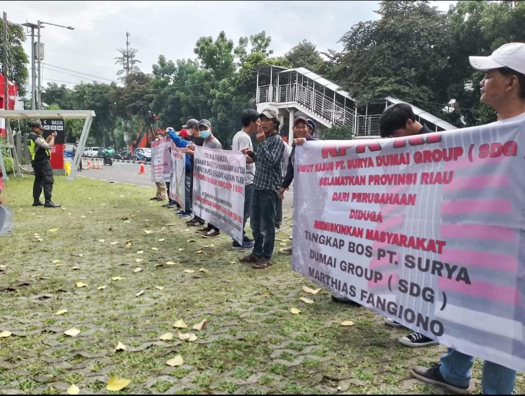 Pantauan di lapangan, puluhan orang ini melakukan aksi unjuk rasa di depan gedung KPK RI dengan membawa berbagai atribut. Mulai dari toa, sejumlah spanduk yang berisi tuntutan mereka soal HGU PT. SDG, dan foto-foto bergambar taipan Martias Fangiono alias Pung Kian Hwa.