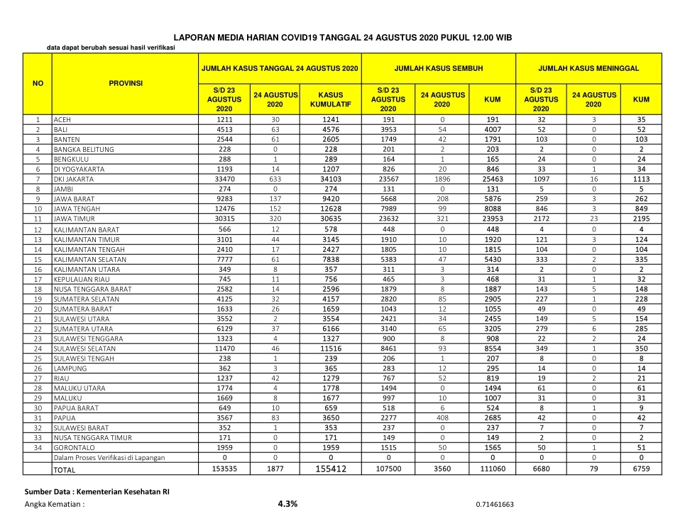 Berikut sebaran kasus positif Corona di 34 Provinsi, Senin (24/8/2020):