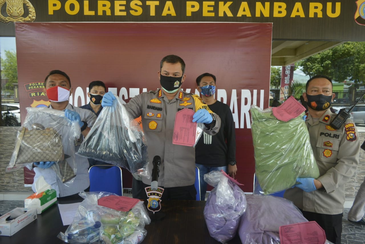 Kapolresta Pekanbaru Kombes Pol Nandang Mumin Wijaya didampingi Kasat Reskrim Kompol Bainar dan Kapolsek Bukit Raya Kompol Bainar, Kamis (24/9/2020).