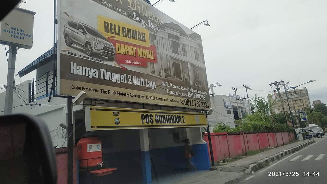 PEKANBARU – Reklame jenis billboard di atas Pos Polisi Gurindam Dua, yang berlokasi di bawah flyover Jalan Jenderal Sudirman dan Jalan Tuanku Tambusai Pekanbaru, sampai Kamis (25/3/2021), belum juga ditebang Satuan Polisi Pamong Praja (Satpol PP) Kota Pekanbaru.