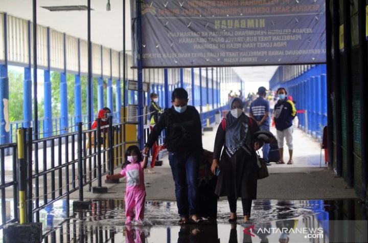Sejumlah penumpang kapal dari Batam saat berjalan di Pelabuhan Bandar Sri Junjungan Kota Dumai, Sabtu (24/4/2021) yang sebagian lantainya dalam keadaan basah. (*/cr9)
