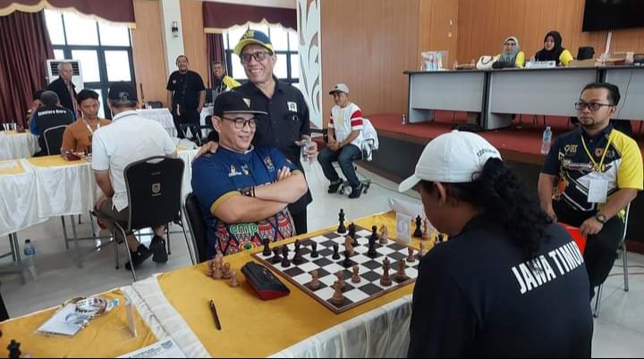 Zulmansyah Sekedang hanya tersenyum mendekap kedua tangan sambil mencoba fokus melihat papan catur; sementara atlet dan juri terlihat serius sedangkan panitia yang di arena cabor catur tersenyum penuh makna.