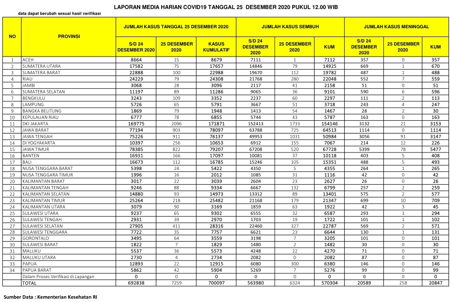 Berikut sebaran 7.259 kasus baru Corona di Indonesia, Jumat  (25/12/2020):