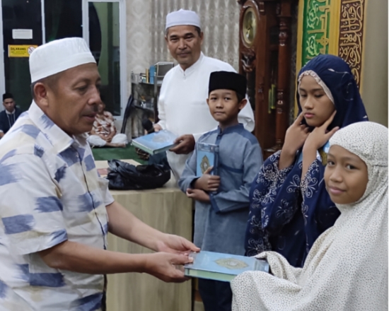 PEKANBARU-Kepala Kantor Wilayah Kementerian Agama (Kakanwil Kemenag) Provinsi Riau, Dr H Muliardi MPd, menyerahkan penghargaan berupa Al-Qur’an bagi anak-anak yang giat melakukan tadarus di bulan Ramadan, di mesjid Paripurna Kelurahan Ijtihadul Muslimin, Kamis (19/3/2026) malam lalu.
