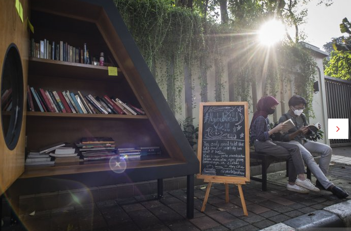 Warga membaca buku di dekat perpustakaan bersama Bookhive Jakarta di kawasan Taman Situ Lembang, Jakarta, Senin (26/4/2021). Pemerintah Kota Jakarta Pusat berkolaborasi dengan Bookhive Jakarta memfasilitasi masyarakat untuk bisa memijam buku secara gratis maupun menyumbang buku secara sukarela melalui perpustakaan bersama tersebut. (*/cr9)