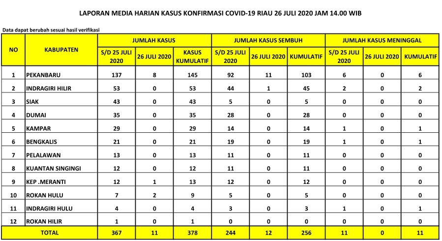 PEKANBARU – Dinas Kesehatan Provinsi Riau menyatakan ada penambahan pasien positif Covid-19 sebanyak 11 orang hari ini, Ahad (26/7/2020). Dengan demikian,  per hari ini jumlah total pasien Covid-19 di Riau menjadi 378 orang.