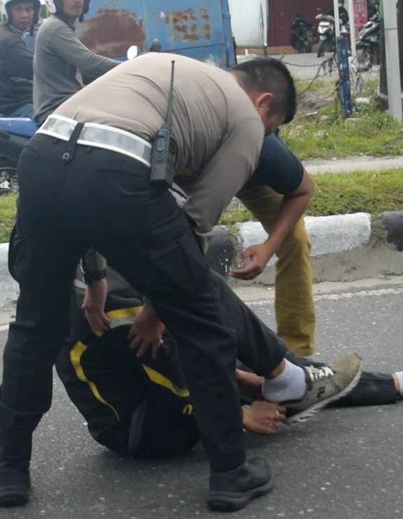 “Saya langsung membantu kedua korban dan membawanya ke RS Aulia Panam untuk dilakukan perawatan medis,” kata Kompol Alvin.