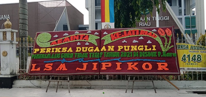 Jipikor lantas memasang papan bunga di depan Gedung Kejaksaan Tinggi (Kejati) Riau yang bertuliskan “Meminta Kejati Riau Periksa Dugaan Pungli Penerimaan Guru Tidak Tetap Tahun 2021 di Disdik P. Baru’,’ pada Jumat (23/7/2021).