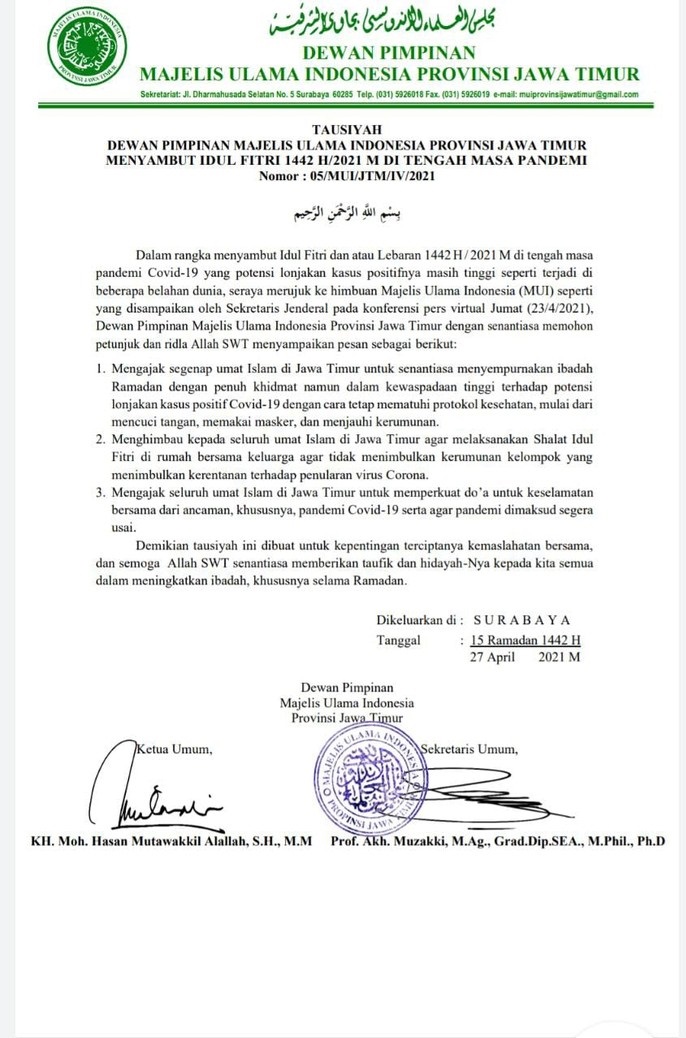 “Kedua, mengimbau kepada seluruh umat Islam di Jawa Timur agar melaksanakan salat Idul Fitri di rumah bersama keluarga agar tidak menimbulkan kerumunan kelompok yang menimbulkan kerentanan terhadap penularan virus COVID-19,” imbuhnya.