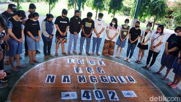 Para siswa SMAK Katolik Hikmah Mandala Banyuwangi tampak mengheningkan cipta sambil membawa rangkaian tulisan ‘Love For Nanggala 402’ lengkap dengan gambar kapal selam, Selasa (27/4/2021). Para siswa tersebut berasal dari beragam agama, mulai dari Katolik, Protestan, Islam, Hindu, Buddha, dan Konghuchu.