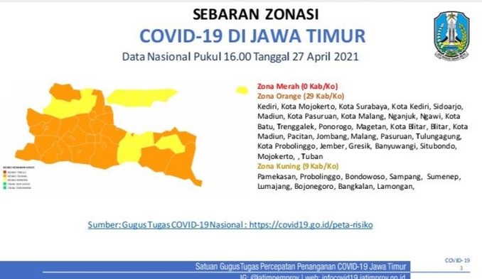“Zona kuning kini 9. Pekan lalu ada 11 kabupaten/kota. Masih belum ada zona hijau,” ujar dr Makhyan Jibril, Jubir Satgas Covid-19 Jatim saat dikonfirmasi detikcom, Rabu (28/4/2021).