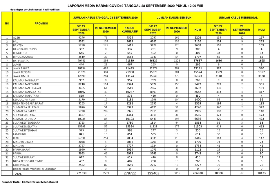 PEKANBARU – Kasus positif virus Corona (Covid-19) di Indonesia hari ini, Senin (28/9/2020), bertambah 3.509 orang. Dengan penambahan tersebut, total kasus positif virus Corona di Indonesia hari ini menjadi 278.722 orang.