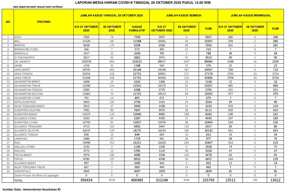 PEKANBARU – Kasus positif virus Corona (Covid-19) di Indonesia hari ini, Rabu  (28/10/2020), bertambah 4.029   orang. Dengan penambahan tersebut, total kasus positif virus Corona di Indonesia menjadi 400.483 orang.