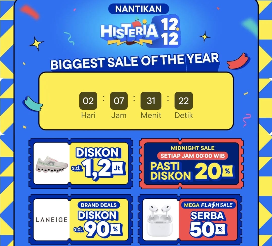 Promo Histeria 12.12 memberikan potongan harga gercep hingga 90 persenan setiap jam 12.00 WIB. Jadi, kamu jangan sampai ketinggalan nantinya!