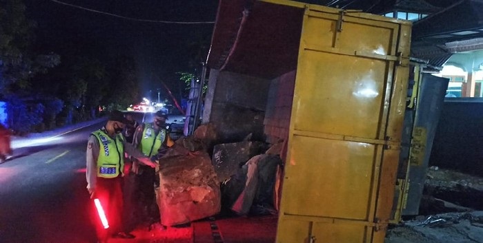 “Truk masih terus melaju kemudian menabrak tiang lampu solar cell sampai akhirnya truk terguling,” kata Paidi.