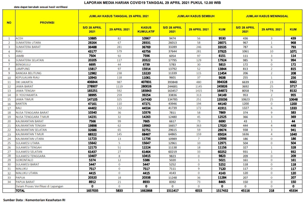 Berikut sebaran 5.833 kasus baru Corona di Indonesia, Kamis (29/4/2021):